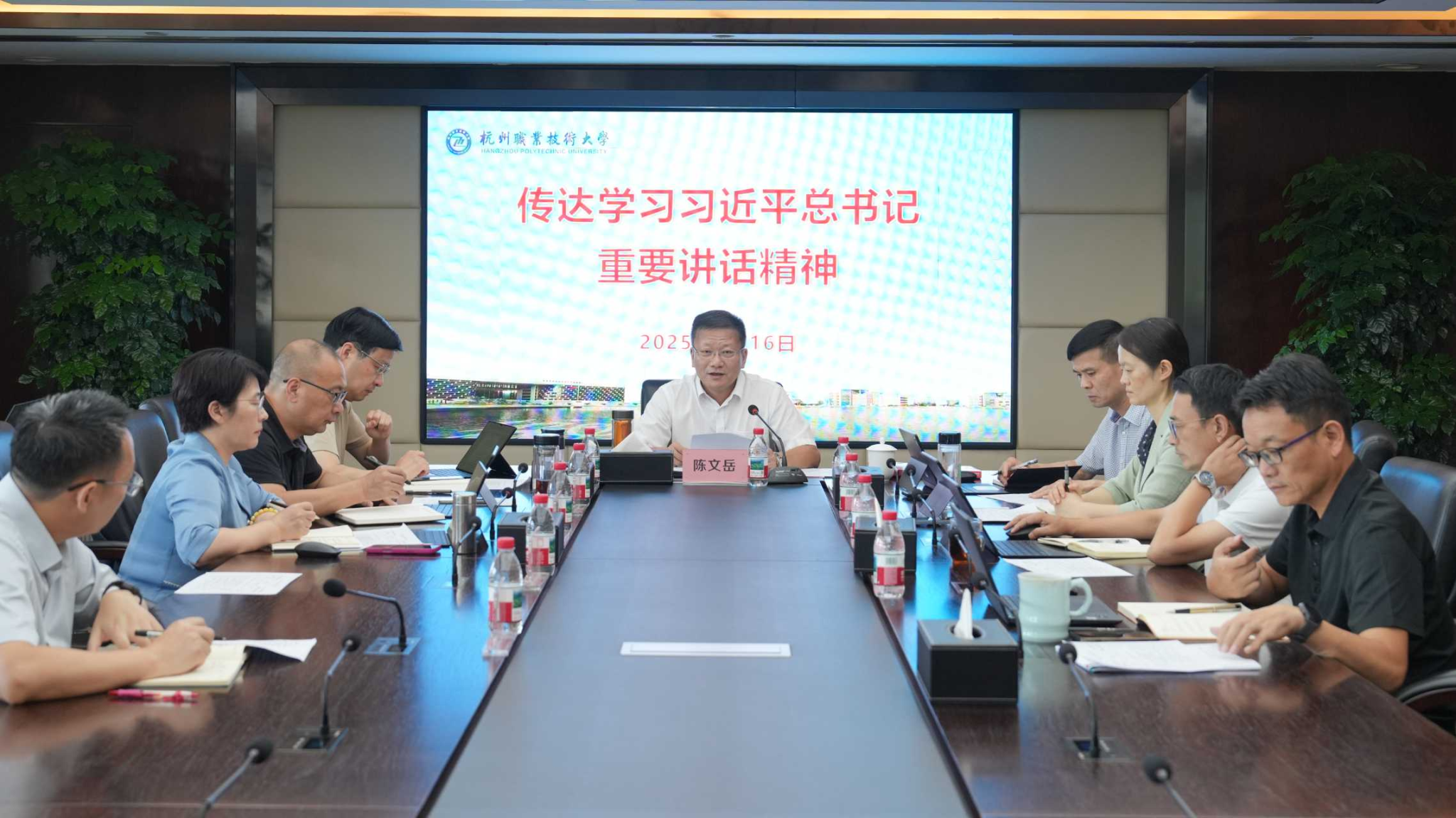 9月16日下午,杭州职业技术大学党委会“第一议题”深入学习贯彻习近平总书记在纪念中国人民抗日战争暨世界反法西斯战争胜利80周年大会上的重要讲话、关于锲而不舍落实中央八项规定精神推进作风建设常态化长效化的重要指示,以及《求是》杂志发表的重要文章《弘扬伟大抗战精神,向着中华民族伟大复兴的光辉彼岸奋勇前进》,研究部署学校贯彻落实举措。校党委书记陈文岳主持会议并讲话,校党委副书记、校长黄兆信作有关精神传达,全体校领导班子成员参加。