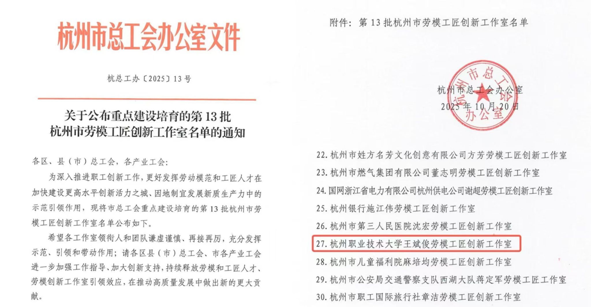 10月20日,杭州市总工会办公室正式下发《关于公布重点建设培育的第13批杭州市劳模工匠创新工作室名单的通知》(杭总工办〔2025〕13号),我校王斌俊老师领衔的劳模工匠创新工作室成功入选。