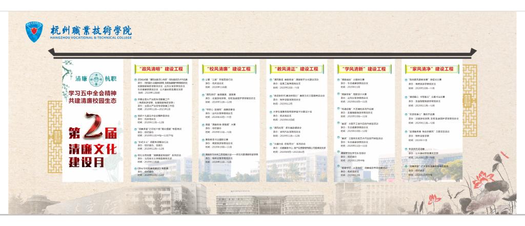 2020年12月—2021年1月,杭职院纪委在全校开展以“学习五中全会精神,共建清廉校园生态”为主题的第二届清廉文化建设月系列活动,30余项项目内容丰富、形式多样,既充分凸显了学校的专业特色,又展现了师生的创新活力与工匠精神,着力助推“清廉杭职”建设提出的“政风清明、校风清廉、教风清正、学风清新、家风清净”“五大工程”目标,不断推进“清廉杭职”走深走实和高质量建设。